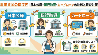 目次導入「事業資金が必要」なのに、その先をご存知ですか?3つの融資方法の違い日本公庫融資の仕組みと審査銀行融資との違いカードローンの現実融資審査に通るための準備まとめ:融資を受ける前のチェックリスト「事業資金が足りない」なら、まず銀行の前に...