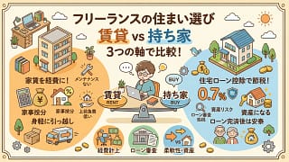 フリーランスの賃貸vs持ち家を経費・ローン審査・住宅ローン控除の3軸で比較。家賃の家事按分、持ち家の減価償却費、事業使用割合50%ルール、ローン審査に通るための準備まで、個人事業主の視点で解説します。