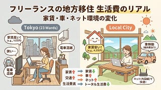 フリーランスが地方移住した場合の生活費を東京と比較。家賃は大幅減でも車の維持費が月2.5万円発生し、実質の削減額は月3〜8万円に。ネット環境の確認方法、移住支援金、届出手続きまでまとめました。