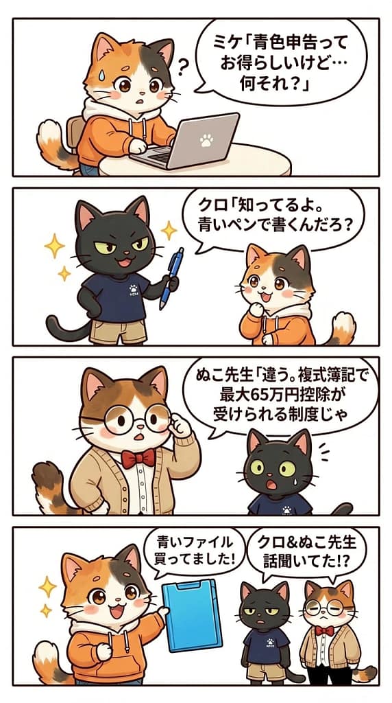 青色申告を選ぶと、複式簿記で帳簿をつけることで最大65万円の所得控除が受けられます。年収400万円なら約13万円の節税になる計算です。