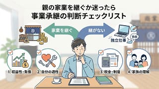 資産・保険・相続 親の家業を継ぐか迷ったら|事業承継の判断チェックリスト 親の家業を継ぐか迷っている方へ。事業承継の判断チェックリスト10項目、贈与税・相続税の基礎知識、事業承継税制の活用法、継がない場合の選択肢(廃業・M&A)まで、判断に必要な情報をわかりやすく整理しました。 2026.03.28 資産・保険・相続