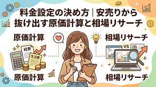 事業のお金と契約 料金設定の決め方|安売りから抜け出す原価計算と相場リサーチ フリーランスの料金設定を原価計算と相場リサーチで決める方法を解説。最低時給の算出手順、相場の調べ方、松竹梅3プランの提示術まで、安売りから抜け出す具体的なステップを紹介します。 2026.04.03 事業のお金と契約