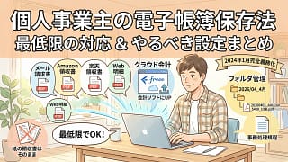 会計ソフト・帳簿 電子帳簿保存法の最低限の対応|個人事業主がやるべき設定まとめ 電子帳簿保存法で個人事業主が最低限やるべきことを解説。義務なのは電子取引データの保存だけ。会計ソフトあり・なし別の3ステップ対応法、改ざん防止措置、売上5,000万円以下の緩和措置まで具体的にまとめました。 2026.04.03 会計ソフト・帳簿