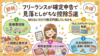 確定申告・税金 フリーランスが確定申告で見落としがちな控除5選|知らないだけで数万円損しているかも フリーランスが確定申告で見落としやすい5つの控除を解説。医療費控除・セルフメディケーション税制・社会保険料の追納・小規模企業共済・寄附金控除(ふるさと納税)の適用条件と節税額の目安をまとめました。 2026.02.18 確定申告・税金
